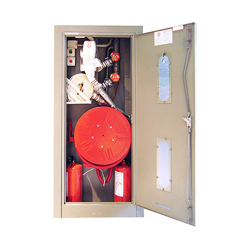 Пожарные шкафы предназначены для размещения в них пожарных кранов, они могут быть как встроенными, так и навесными, имеют приспособления для опломбирования, отверстия для проветривания и визуального осмотра без открытия. Так же в них предусмотрено место для хранения двух огнетушителей. На дверцах шкафа в которых находятся огнетушители должны быть нанесены соответствующие указатели согласно ГОСТ 12.4.026-76 «ССБТ. Цвета сигнальные и знаки безопасности».